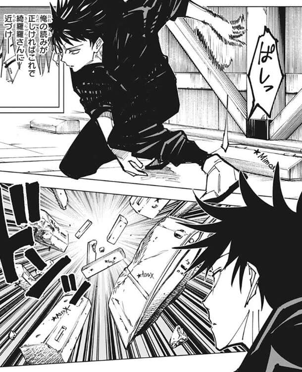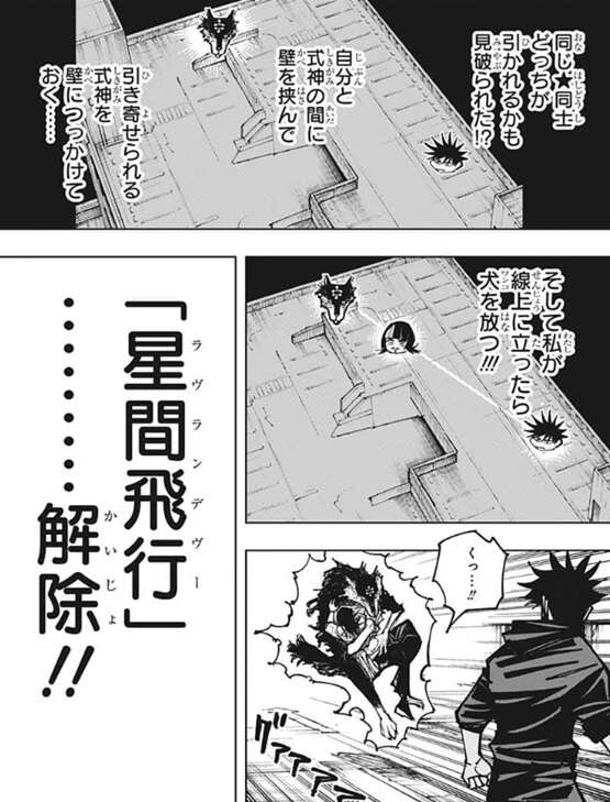 星綺羅羅は伏黒が自分の術式を攻略した事を褒めますが、星綺羅羅に付いている「Ginan、ギナン」を外せば新たに伏黒と同じ「AcruX、アクルックス」は付けられるそうです。多数の物体に★をマーキングして伏黒にぶつけた星綺羅羅は勝利を確信しますが、いつの間にか伏黒の玉犬が星綺羅羅の背後にいて、玉犬はそのまま星綺羅羅の方に引き寄せられ、星綺羅羅を捕まえます。