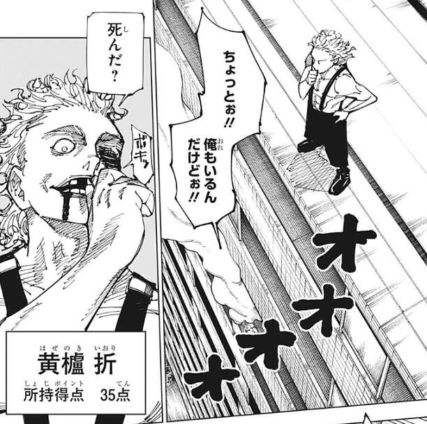 伏黒が躊躇している隙に、黄櫨は再び自分の歯を使用して、爆発を起こします。今度こそ伏黒は爆発をくらってしまいそうになりますが、何者かが伏黒を爆発から護ります。レジィ、黄櫨、伏黒の三人が突然の乱入者に驚いていると、2対1で本当に公平なのかい?君達のような人間は卑怯者だ、卑怯者の攻撃は効かん……!!と、啖呵を切ると、ダメージゼロだぜぇ!!と、叫びます。しかし、頭部から結構な量の出血があり、どうみてもダメージゼロではありません。乱入者は芸人術師・髙羽史彦で、以前の回で芸人として劇場に立っている様子が描かれていました。伏黒も髙羽の言動にあきれていますが、髙羽は伏黒の味方となるのでしょうか?