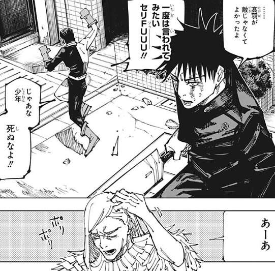 髙羽の戦いっぷりに、……髙羽が敵じゃなくてよかったよ、と伏黒はつぶやくと、一度は言われてみたいセリFUUU(フゥーーー)!!と、髙羽は叫びながら蹴り飛ばした黄櫨の方に走っていきます。