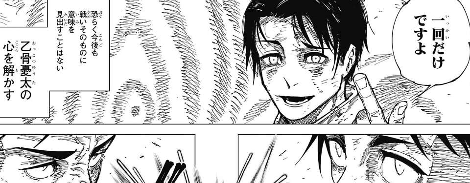 しかし、石流の400と余年の渇望、渇きに比例した熱い眼差しが乙骨の心を解かします。恐らく今後も戦いそのものに意味を見出すことはないと思われる乙骨ですが、あえて石流と同じタイミングで呪力を放出します。
