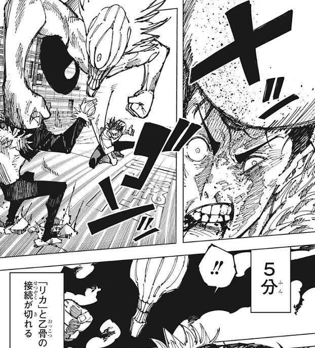 さらに「リカ」が石流の頭を殴り石流にダメージを与えますが、次の瞬間「リカ」と乙骨が接続できる時間である5分を過ぎてしまい、「リカ」と乙骨の接続が切れてしまいます。