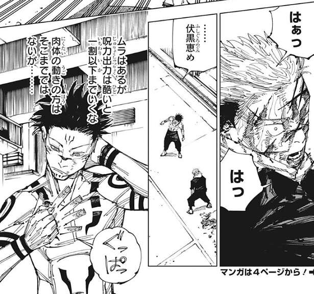 一方、虎杖と戦う宿儺ですが、肉体の動きや呪力出力に制限があるようで、虎杖のパンチをくらっています。肉体の動きはそこまでではないようですが、呪力出力にはムラがあって酷いと一割以下まで落ちるようです。それでもここで虎杖を殺す分には特に不自由はしない、と宿儺は考えますが、そこに真希が合流します。