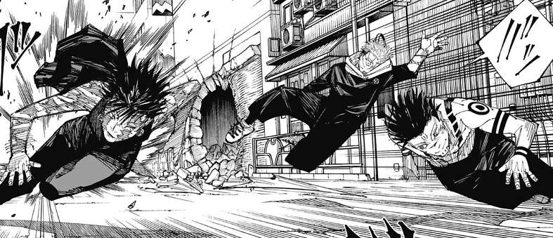 虎杖&真希 対 宿儺の形になり、虎杖は顔面を殴られますが、真希は体術で宿儺を殴った後、柵まで吹っ飛ばします。虎杖は柵を利用して宿儺を捕らえようとしますが、宿儺は簡単に柵から脱出します。