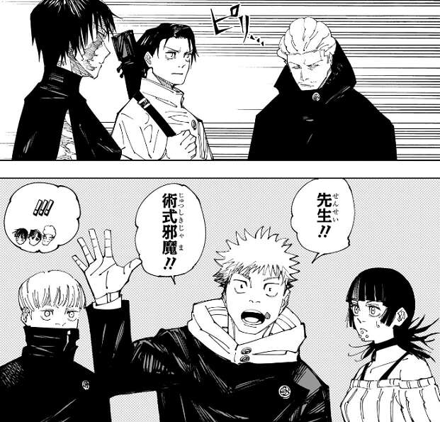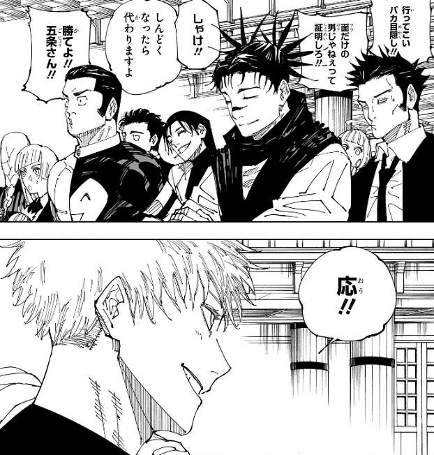 高専メンバー、各々が五条に言いたいことを言って、宿儺に勝つように五条を励まします。五条も高専メンバーに、応!!と、答えます。一方の宿儺ですが、不気味に笑みを浮かべています。