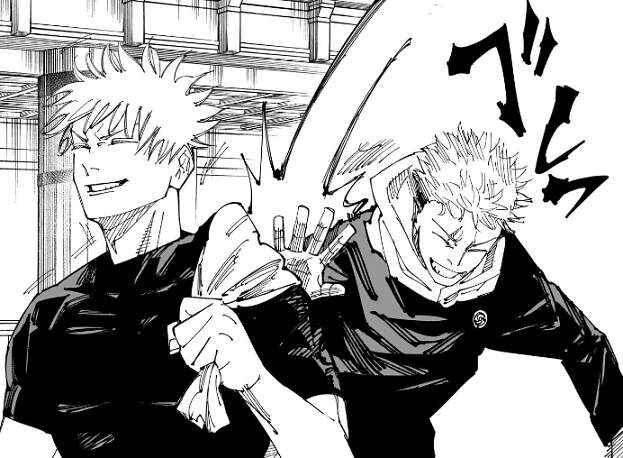 虎杖が日下部を柔道の投げ技で投げ飛ばし、アップ運動はこんなもんでいいだろう、そろそろ掴めよ、虎杖、と日下部に話しかけています。しかし虎杖が日下部に“虎杖”と言っている所から、どうも虎杖と日下部の肉体と精神が入れ替わっているように見えます。しかし、何の特訓をしているか含めて詳細は不明です。