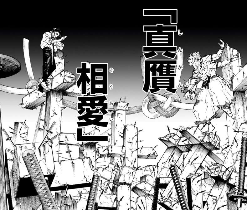乙骨は領域展開「真贋相愛(しんがんそうあい)」を使用します。乙骨の領域内には無数の刀が刺さっていて、空にはご祝儀袋に使用される水引きが垂れ下がっています。