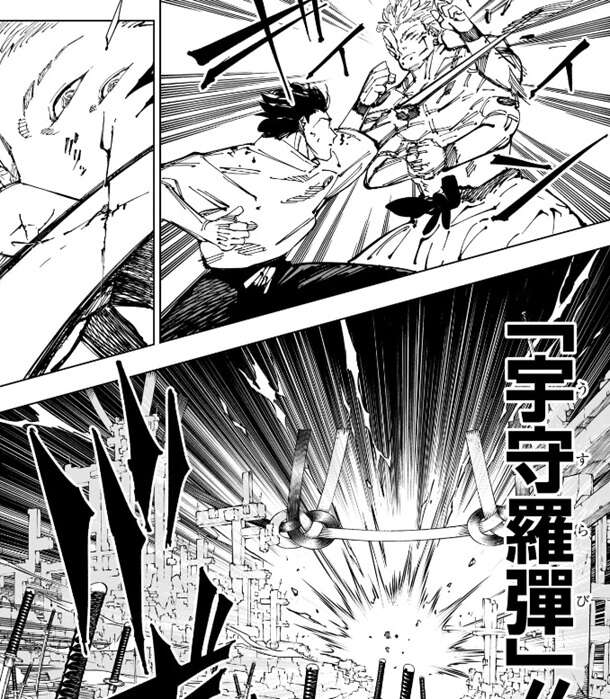 宿儺が彌虚葛籠を使って防御すると、乙骨は領域内に刺さっている刀を抜いて宿儺を攻撃、さらに宇守羅彈(うすらび)で宿儺を攻撃します。宇守羅彈(うすらび)は烏鷺亨子の技ですが、乙骨が模倣(コピー)して使ったようです。