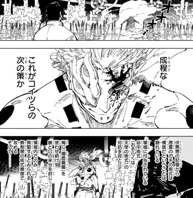 宿儺は乙骨の術式が模倣(コピー)だという事は、伏黒の記憶から既にしていました。そして、領域に付与されているのが天使の術式と推測し、その対抗手段として彌虚葛籠を使わせ続け、腕と口の半分を封じようとしている事も推測します。ここで、宿儺が乙骨の事を憑霊のガキと言っているので、前回憑霊のガキが猪野か乙骨か、断定できないとまとめで書きましたが、乙骨で間違いないようです。