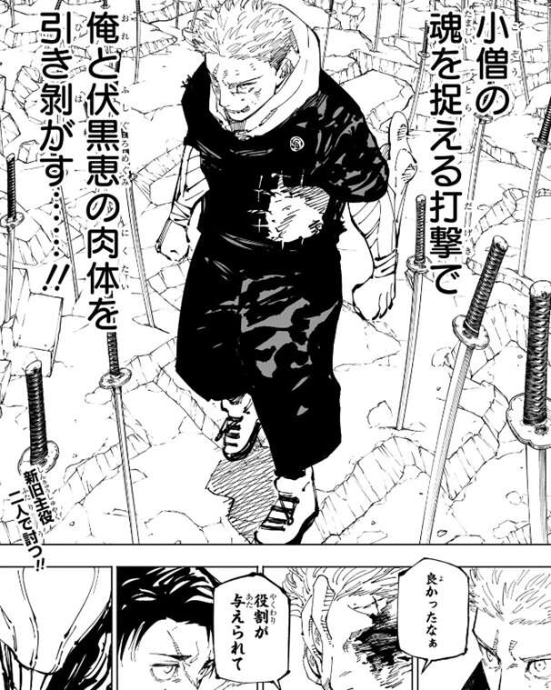 そして、領域内でのみ発動するとみられる無制限の術式模倣(コピー)で乙骨が宿儺を攻めつつ、虎杖の魂を捉える打撃で、宿儺と伏黒恵の肉体を引き剥がす事が、次の作戦だと宿儺は推測します。虎杖、宿儺、乙骨、リカが対峙する中、宿儺は、良かったなぁ、役割が与えられて、と虎杖につぶやきます。