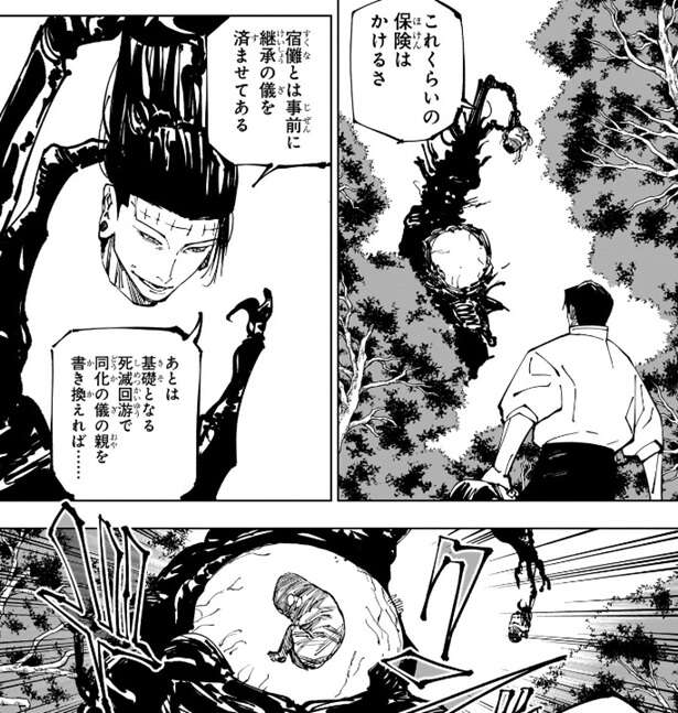私の意志は受け継がれる、と羂索が言った後、羂索のコントロールを失ったことで、呪霊操術の暴走が始まります。