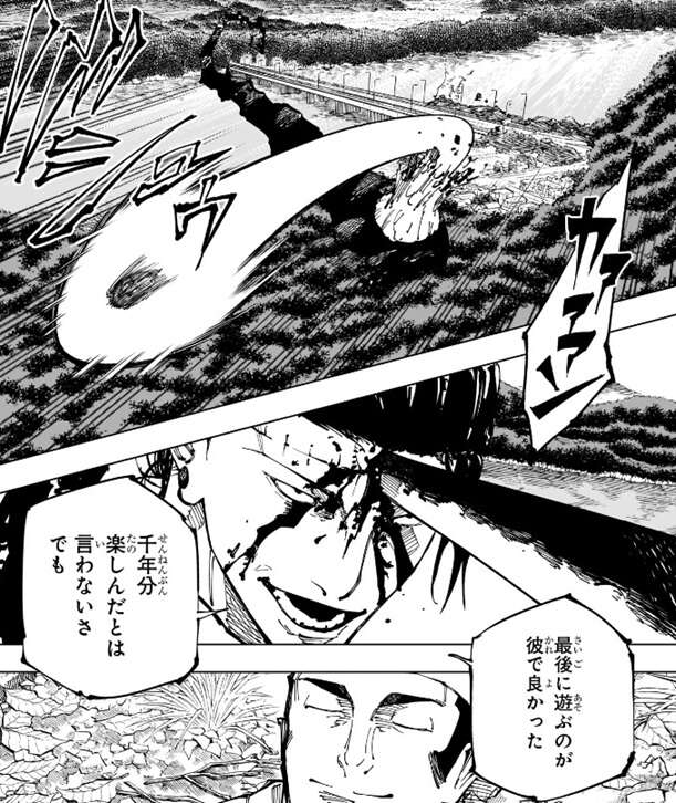 天元が新宿へと向かって飛んで行った後、千年分楽しんだとは言わないさ、でも最後に遊ぶのが彼で良かった、と羂索はつぶやき、髙羽と戦えて良かったと言いますが、そのセリフを言っている間に乙骨に刀で額を貫かれて、羂索は死んでしまいます。