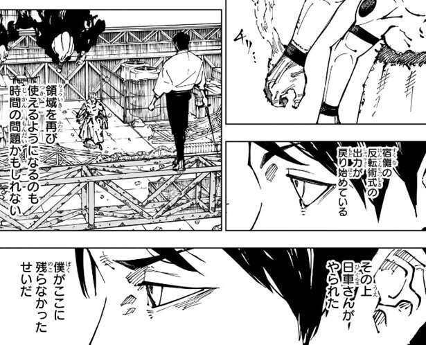 場面は新宿に戻り、乙骨は宿儺の傷が治っているのを見て、宿儺の反転術式の出力が戻り始めている事に気付きます。このままでは宿儺が再び、領域を使えるようになるのも時間の問題かもしれない、と乙骨は予想し、日車がやられた事も自分のせいだ、と自分で自分を責めます。岩手県御所湖結界(コロニー)には行かず、「処刑人の剣」のプランを全力でサポートするべきだったのでは?羂索の奇襲は真希でもよかったんじゃないのか?など、乙骨の頭に色々な考えが浮かんできます。しかしそんな考えをすぐに否定し、呪霊操術の暴走は渋谷での呪霊放出を最大規模として、それを人的被害なく食い止めるにはリカちゃんの力が不可欠だった、と乙骨は自分に言い聞かせます。