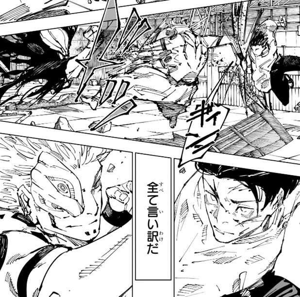 乙骨はもう一度刀を握ると、宿儺を刀で攻撃し、リカも背後からさらに畳みかけます。乙骨は宿儺を攻撃しつつも、心の中では、全て言い訳だ、とつぶやきます。