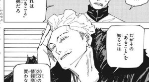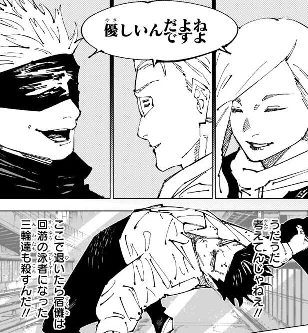 再び場面は冥冥、七海、五条が日下部の事を語るシーンになりますが、要は優しいんだよね、と三人は口をそろえて日下部を一番に推す理由を語ります。日下部と宿儺の戦いに戻り、うだうだ考えてんじゃねぇ、ここで退いたら宿儺は回游のプレイヤーになった三輪達も殺すんだ!!ガキ共が命かけて戦った!!大人の俺が必死こかなくてどうするよ!!と、日下部は戦う理由を自分に言い聞かせます。
