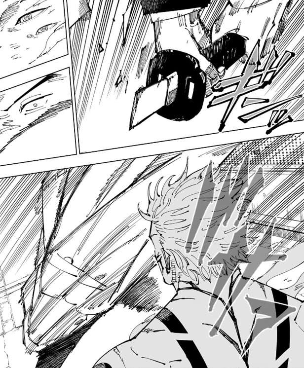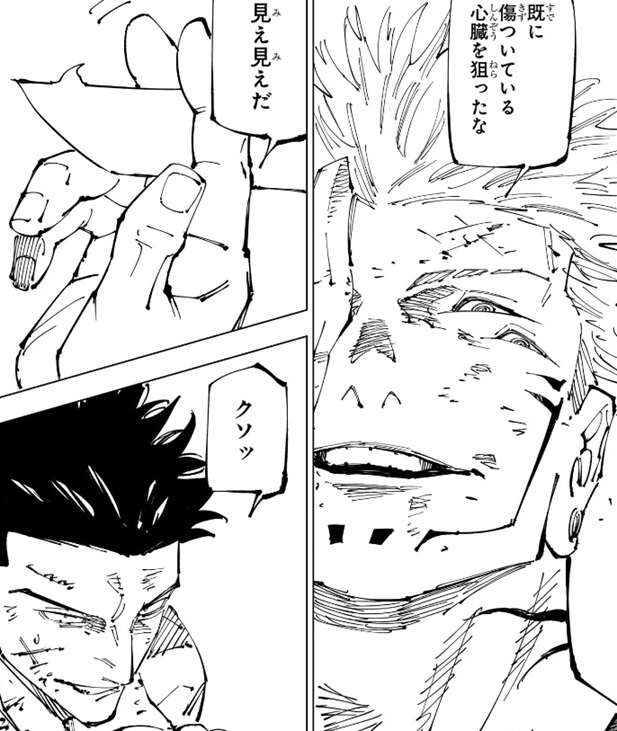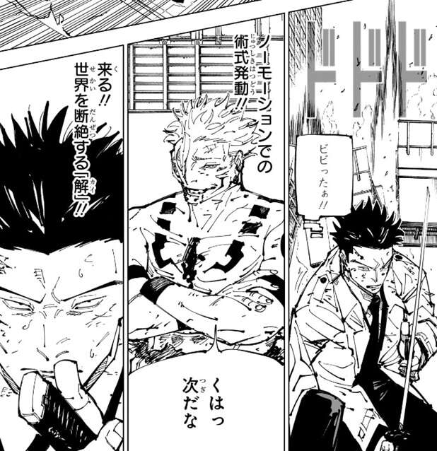 実際、宿儺を簡易領域の範囲内に引き込んだ後、日下部の居合がフルオート反射で宿儺を迎撃します。宿儺の体は日下部の居合で体全身を斬られて出血します。