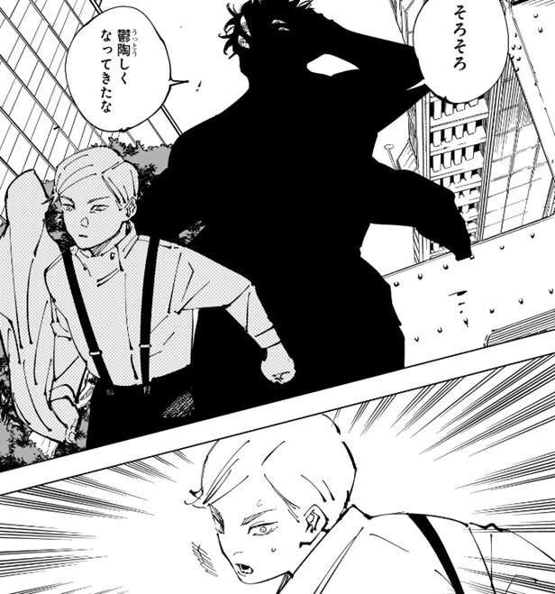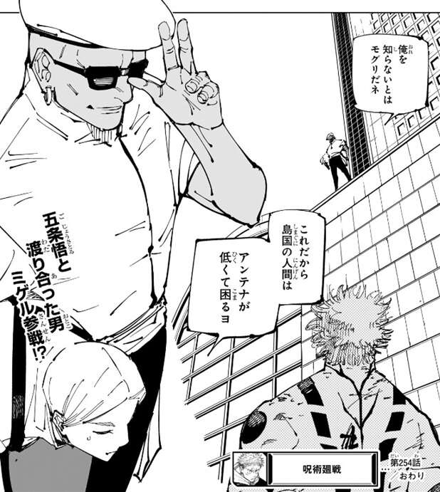 そこに突然ミゲルが現れ、斬撃が憂憂に当たる前に憂憂を抱えて、ミゲルはビルの上に移動します。宿儺は、知らん顔だな、とミゲルに言いますが、俺を知らないとはモグリだネ、これだから島国の人間はアンテナが低くて困るヨ、とミゲルは宿儺を上から見下ろす形で言い放ちます。