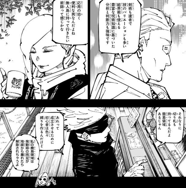 ここで再び回想に入り、冥冥と七海が日下部の強さを語っています。冥冥は、日下部よりも私や七海の方が馬力は上だが、応用が効く便利な男と日下部を評価します。無人島に持っていきたい術師って感じ、と日下部を表現します。七海は、日下部には勝つイメージというより負けるイメージが湧かないと言い、剣術も達者で技のバリエーションも多い、結界術も使える、豊富な術式知識に基づいた分析と判断力も強みだ、と日下部を絶賛します。さらに五条は、縛りなしで簡易領域を成立させられるのが日下部は強みだと言います。初心者は色々縛りを作るようで、三輪も簡易領域を発動する時は、両足が地面から離れては駄目という縛りを作っているようです。三輪は両足が地面から離れると、簡易領域が解除されてしまうようですが、日下部にはそんな縛りは一切ありません。
