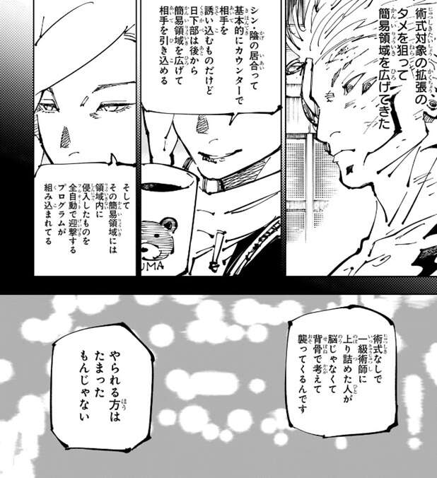 場面は日下部と宿儺の戦いに戻り、日下部は宿儺が世界を断絶する斬撃を使う為にタメが必要と推測しており、実際に宿儺は世界を断絶する斬撃を使うのに掌印を結んだり、呪詞の詠唱を行ったりしています。日下部はそのタメの時間を狙って簡易領域を広げて、宿儺を領域の範囲内に引き込みます。再び回想に入り冥冥は、日下部のシン・陰流の居合は基本的にカウンター狙いで、相手を誘い込むものだが、日下部は後から簡易領域を広げて相手を引き込め、そしてその領域内に侵入したものをフルオートで迎撃するプログラムが組み込まれている、と日下部の強みを説明します。