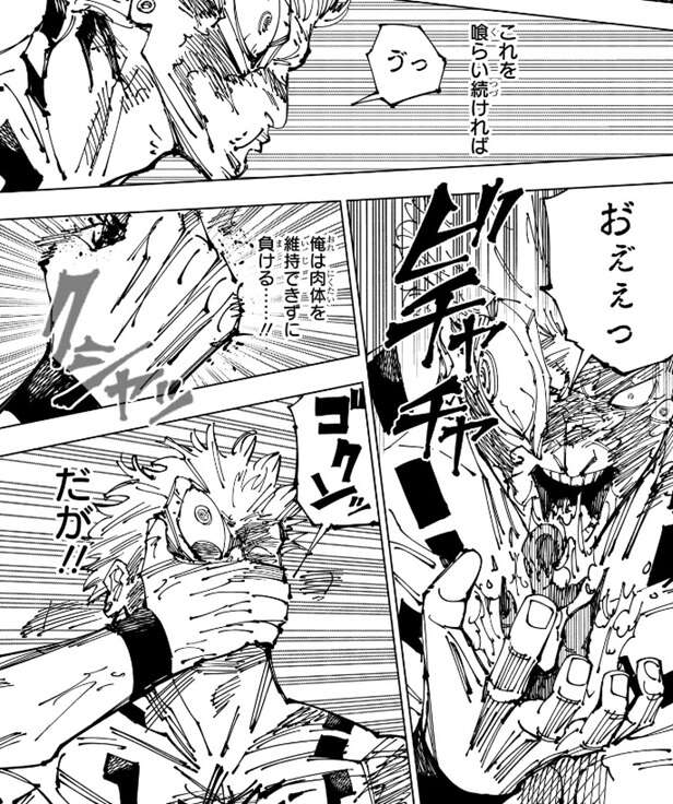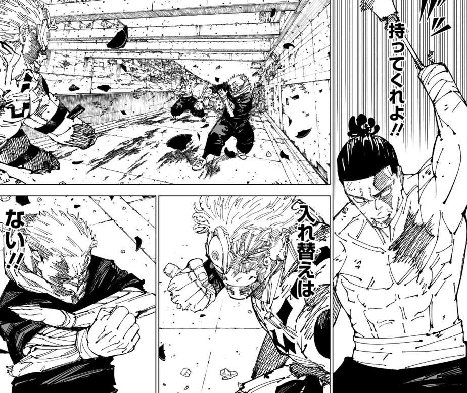 それでも、喰らわなければどうということはない……、と宿儺は判断し、虎杖がさらに繰り出す「御廚子」の斬撃や「解」をかわして、逆に虎杖に打撃を入れます。