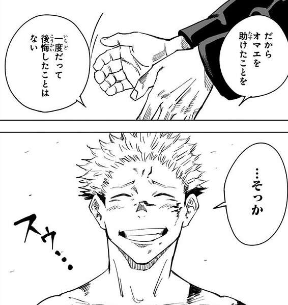 死んだはずの虎杖でしたが、なぜか宿儺の生得領域で宿儺と対峙していました。宿儺から、俺達はまだ死んでいない、と言われ、さらに条件を呑めば心臓を治し生き返らせてやる、と虎杖は言われます。虎杖は一旦宿儺の提案を拒否しますが、最終的に宿儺の縛りで生き返ることになります。