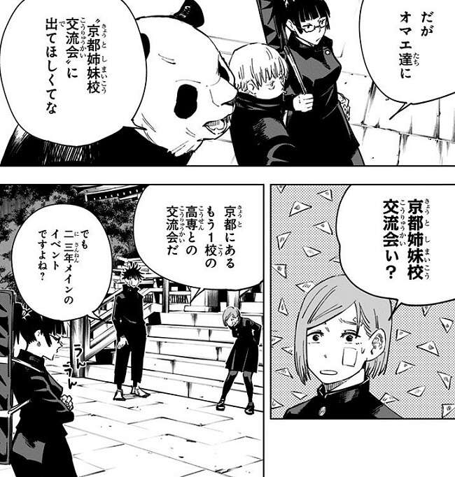 虎杖が死んだことで、五条悟は一年派遣を決定した呪術界上層部に対して怒りますが、家入硝子にたしなめられ自制します。伏黒と釘崎も虎杖の死を知りショックを受けますが、先輩の禪院真希達から“京都姉妹校交流会”出て欲しいと言われ、交流会に向けて特訓を始めます。