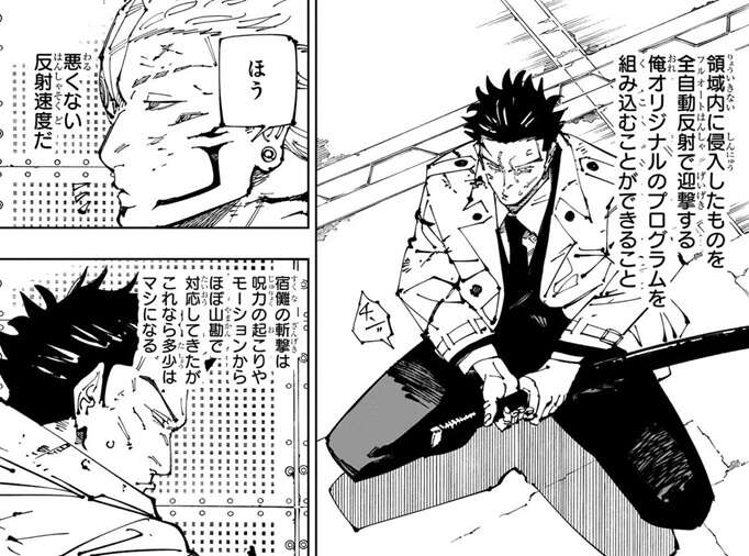 宿儺は日車寛見に五条悟と並ぶほどの才能の原石を魅せられていました。日車は領域展延で宿儺の術式を中和しましたが、日車の処刑人の剣は領域展をはさんでも無効化することはありませんでした。これは日車が宿儺に限りなく近いレベルで術式を運用できるていることを意味し、宿儺は日車一人を狙い撃ちして攻撃を仕掛け始めます。