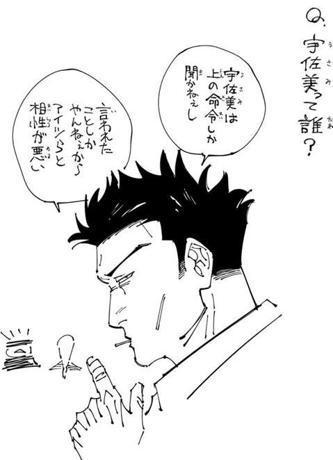 第253話で『最強の一級術師は誰?』という問いの中で、宇佐美と言う名前が出てきました。しかし誰か分からなかったのですが、一応第28巻でヴィジュアルだけ出てきました。宇佐美という術師は上の命令しか聞かず、言われた事しかやらないので五条や冥冥と相性が悪いそうです。