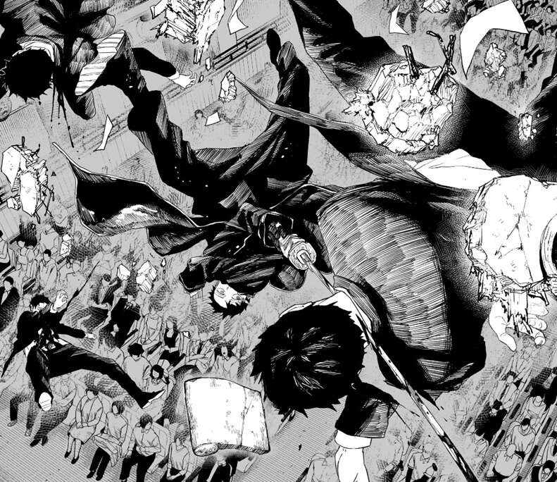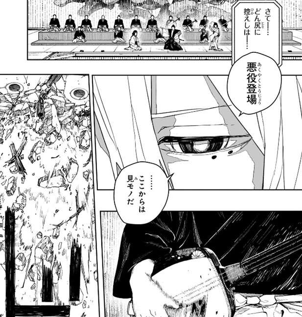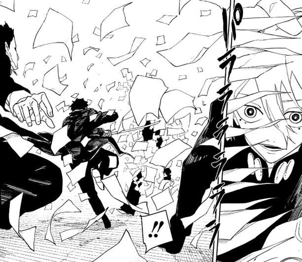 しかし、今チヒロと戦っている3人は昼彦が選定した野良の妖術師で腰の入れ方はわかっている部類のようで、連携もそれなりに出来るようです。一方、チヒロは昼彦の紙の妖術によって視界を的確に邪魔され、さらに味方の妖術師の誘導もしています。今、チヒロと3人の妖術師は劇場の屋根で戦っていますが、昼彦は味方の妖術師を劇場の下に落ちてくるような攻撃をするように紙の妖術で指示します。