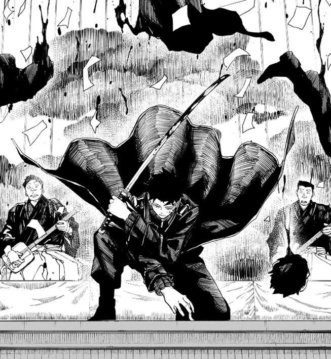 チヒロは落下しながらも妖術師の首を斬り、さらに他の2人の妖術師も斬り殺して全員を倒します。