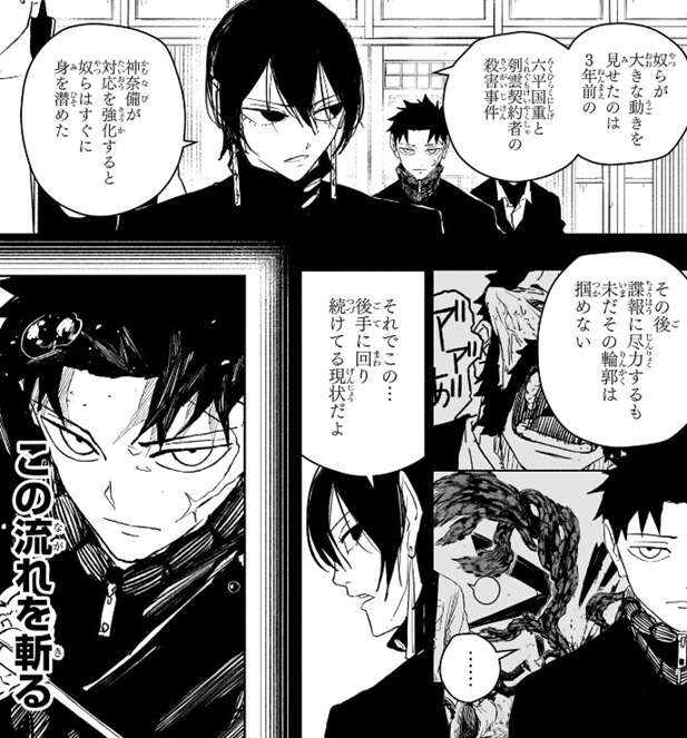 毘灼についてはチヒロも神奈備もよく分かっておらず、大きな動きを見せたのは3年前の六平国重と刳雲契約者の暗殺事件だけです。その後は神奈備が対応を強化すると毘灼はすぐに身を潜め、諜報に尽力するも未だに組織の輪郭は掴めていません。香刈緋雪は、それでこの…後手に回り続ける現状だよ、と嘆きますが、昼彦と対峙したチヒロはこの流れを斬り、目の前の毘灼から構成員・計画そして目的、知る全てを吐かせようとします。