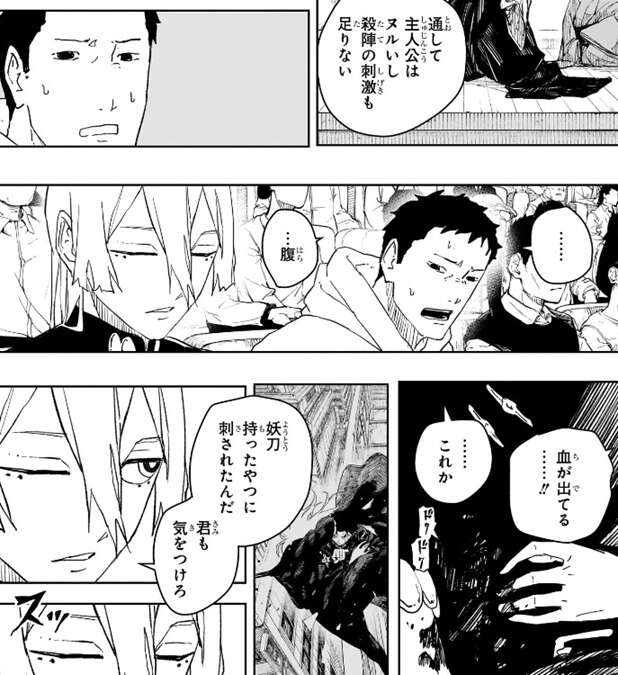 さらに、通して主人公はヌルいし殺陣の刺激も足りない、つまらない、と感想を一方的に話し始めます。当惑する隣の客ですが、昼彦の腹から血が出ている事に気付き驚きます。どうやら先ほどチヒロが淵天で斬りかかった時に、かわし切れなかったようで腹から出血していました。隣の客が腹の血を指摘すると、妖刀持ったやつに刺されたんだ、君も気をつけろ、と注意すると、昼彦は目を閉じます。