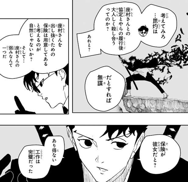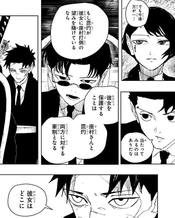 巻墨の隊長は、毘灼が座村との協定の履行後、大人しく殺し合うってのか?だとすれば無謀(バカ)、と言います。そして、座村を出し抜くための保険を用意してあると考えるのが自然で座村の弱みは一つしかないと巻墨の隊長は言います。しかしそれが巻墨の娘だとして、娘の死の偽装に感づかれたとしても彼女に辿り着くのは不可能、ともう一人の巻墨は言います。もう一人の巻墨が不可能と断言するのは、巻墨の娘に施した妖術に自信があるからのようです。