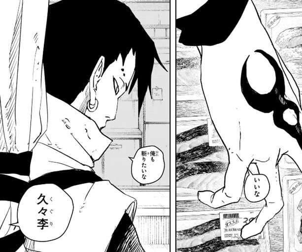 毘灼のメンバーと思われる人物が、スーパーの鮮魚コーナーで魚の切り身を見ながら、俺も斬りたいな、とつぶやいていると、もう一人の毘灼のメンバーと思われる人物から、久々李(くぐり)と名前を呼ばれます。