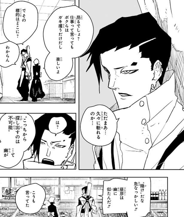 久々李は、久々に斬れるのか…、とつぶやくと、昂るでしょ?仕事って言ってもボクらはガキ攫うだけだし、楽しいよ、ともう一人の毘灼のメンバーが久々李に言います。ガキを攫うと言っているので、この毘灼のメンバー達の目的は座村の娘の誘拐と思われます。久々李は標的の居場所を聞きますが、幽が“こっちから探し出すのは不可能”と言っていたと毘灼のメンバーが言うと、久々李は“賭け”だな危なっかしい!!昼彦は幽に似たんだ!!と文句を言います。しかし、幽は“向こうから尻尾を出すだろう”とも言っていたと久々李に伝えます。