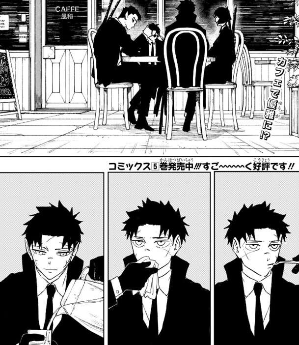 チヒロと巻墨がカフェで食事をしていますが、巻墨はチヒロにご飯を食べさせたり、口元が汚れいると拭いてあげたり、水をついであげたりとつきっきりでお世話をしていて、かなり過保護です。巻墨の隊長から、あんたがしばらく巻墨の主だ、とチヒロは言われますが、過保護すぎます、とチヒロは答えます。