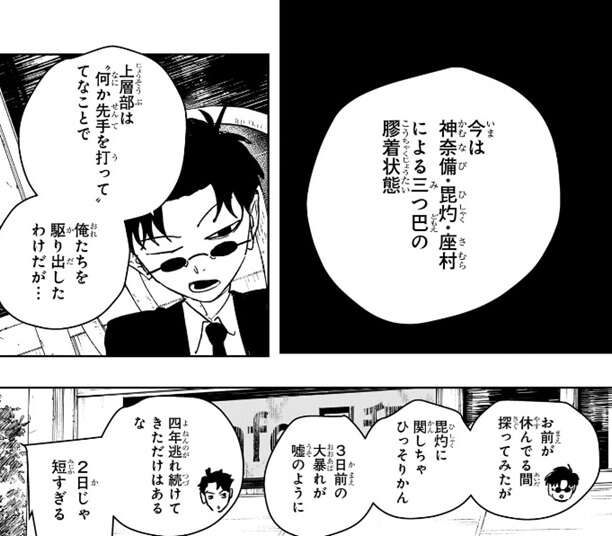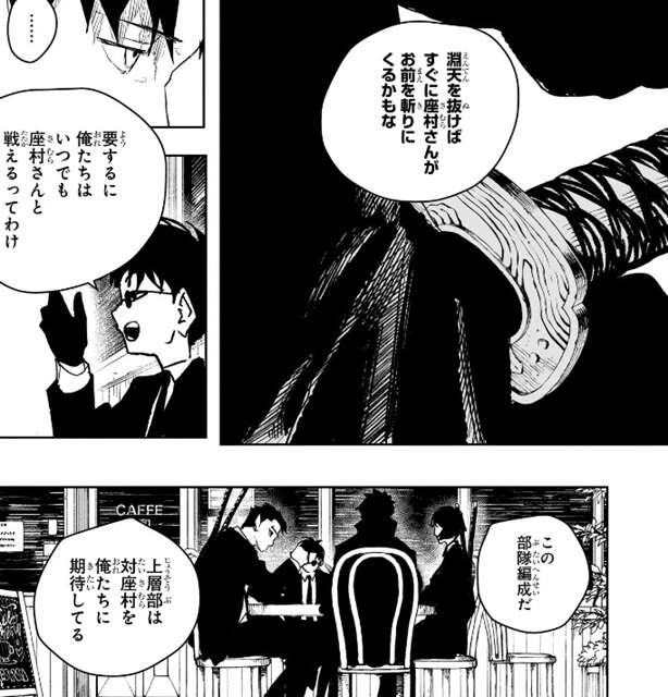 もしくは、チヒロが淵天を抜けばすぐに座村がチヒロを斬りにくるかもしれない、俺たちはいつでも座村と戦えるってわけ、と巻墨の隊長は言い、上層部は対座村を俺たちに期待していると推測します。巻墨自身もいち早く座村にキレに行きたいようですが、毘灼に圧力をかけられるのは座村だけで、現状は毘灼に好きに動かれて一般人に危害を加えられるのが最悪なケースなので、うかつに座村と戦闘になるわけにはいかないようです。毘灼の情報が掴みきれないまま、座村と戦闘に突入してしまうと、毘灼が再び暴れ出す最悪のケースが起きてしまうので、結局チヒロには妖刀はしばし抜かなくていい、と巻墨の隊長はチヒロに注意します。
