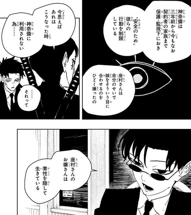 巻墨は座村がチヒロを一度殺したというのを聞いて、座村にとって“死”は大事な人を遠ざける常套手段なのかもと思ったよ、と言います。そして、巻墨が座村の下について一度だけ忍びとしての任務を受けたと言い、その任務というのが彼女の死の偽装だったと明かします。神奈備は三年前から契約者の家族まで保護・監視下に置いていて、“安全のため”という名目で彼らの行動を制限しているそうです。座村は自分のせいで娘がそういう目に遭うのをひどく嫌ったそうで、巻墨は今思えば死の偽装はこうなった時、神奈備に利用されない為、と巻墨は推測します。そして、巻墨は座村の娘は素性を隠して生きている事をチヒロに明かしますが、チヒロは座村の娘を人質にすることに反対します。巻墨の隊長も座村の娘を戦いの場に連れるつもりなんてないと言い、重要なのは人質(そこ)じゃない、と指摘します。