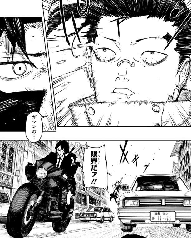 そして久々李の斬欲がパァンとはじけると、ガマンの…限界だァ!!と叫び、チヒロと斬り合いを始めます。その様子を見て炭は、まけたみたい、とつぶやきながらバイクを走らせます。