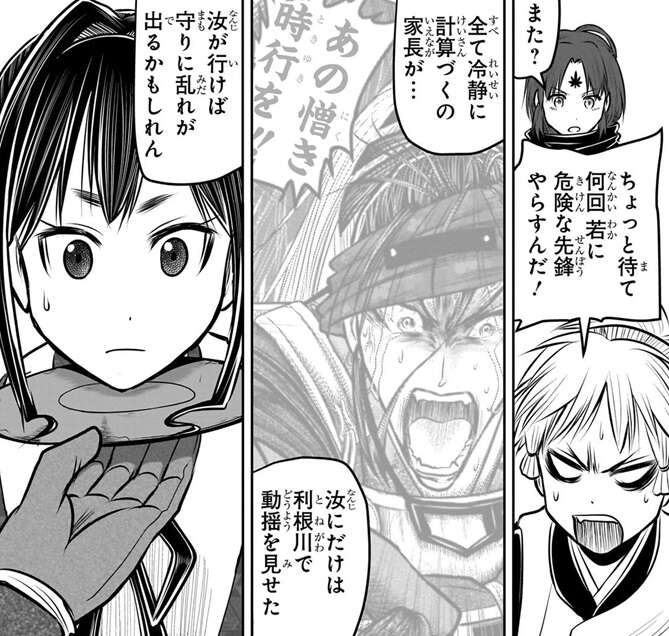 利根川の戦に大勝利した時行は、顕家に顕家軍の将達を紹介してもらいます。執事の春日顕国と指揮官の伊達行朝は常識人で、時行を歓迎します。しかし結城宗広は一見常識人に見えますが、実は保科党にいたシリアルキラーの結城三十郎の父親で、この結城宗弘も三十郎と同様、重度のシリアルキラーでした。さらに南部師行もあからさまに時行を馬鹿にする、癖の強い人物です。弧次郎は南部の失礼な態度に腹を立てますが、時行は尊氏を倒す為と顕家軍の将と一から信頼を築いていこうと心に誓います。