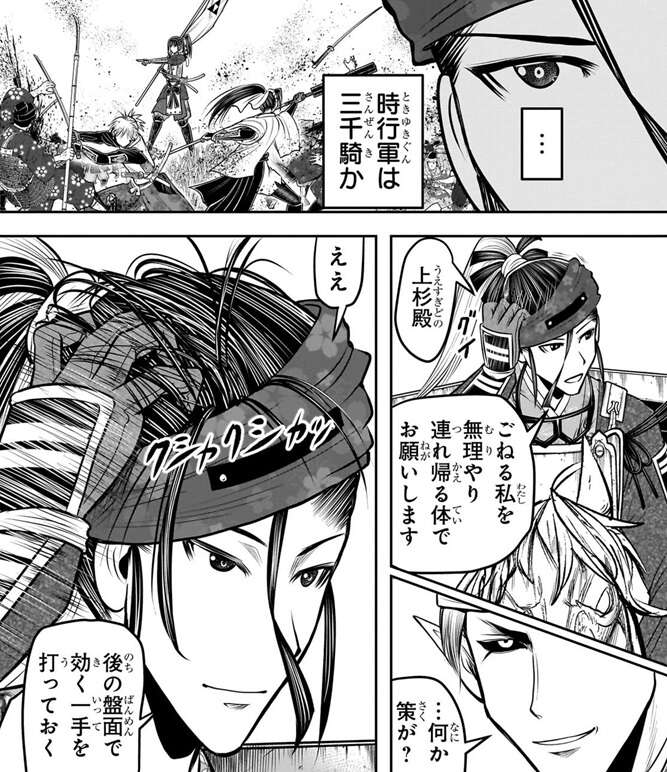 時行や弧次郎、亜也子は新技を決めて足利軍を圧倒、そのまま前衛を撃破します。このまま斯波家長のいる杉本寺まで攻めようとしますが、杉本寺は無数のやぐらと堅固な柵が設置された山城となっていて正面撃破は出来そうもありません。そこで、川周辺の敵を片付けて水源を断ち、敵が干乾びるのを待つ作戦を行う事にします。そして川周辺の敵は大将・顕家自らが出陣し、敵を撃破していきます。