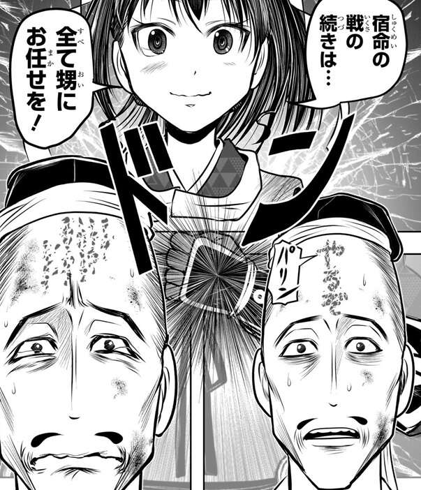 時行は貞宗の奥義技「射将共射馬」を何とか防ぎ、貞宗に一矢報います。その後、時行軍は雫の策で貞宗を撤退させる事に成功します。他の戦場の伊達軍、南部軍、結城軍、新田・宇都宮軍も勝利し、後は顕家軍本隊と土岐軍の戦いのみですが、顕家軍本隊の四万騎は土岐軍のたった千騎相手に苦戦していました。
