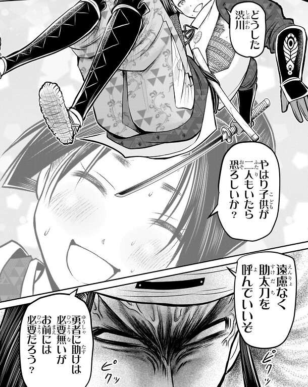 北条時行と弧次郎の二人がかりで渋川に挑みますが、渋川と主に戦うのは北条時行で、弧次郎は渋川の背後をちょこまかと動いて隙を狙うだけで攻撃しようとせず、足利側は北条時行の戦い方に困惑します。さらに、北条時行は渋川を思いっきり挑発して怒らせ、渋川をさらに強化させるように戦い方をします。