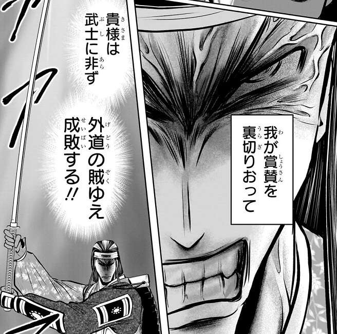 北関東を突破した北条軍は、武蔵国 久米川に布陣する関東庇番衆と対峙します。渋川義季は北条時行に目通りを願うと、そのまま一騎打ちによる決着を望みます。当然、子供の北条時行が大人の渋川相手に一騎打ちを受けるわけもありませんが、先走った弧次郎が勝手に渋川に一騎打ちを挑みます。一方、正々堂々と一騎打ちを申し入れたのに応じなかった北条時行を、武士らしくないと渋川は勝手にキレてしまい怒りに任せて弧次郎を吹っ飛ばします。