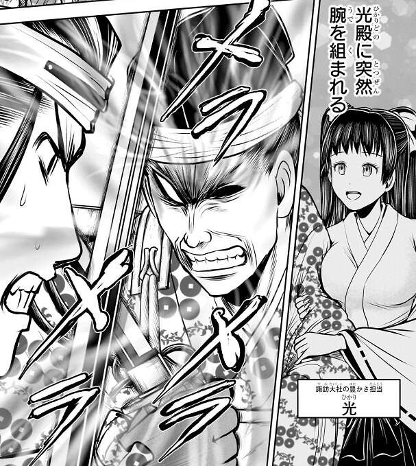 石塔は亜也子と戦いながら、彼女に質問攻めをします。石塔には理想の女神である鶴子ちゃんが脳内にいますが、亜也子の長所を取り入れてより鶴子ちゃんを魅力的にする為に、亜也子を質問攻めにしていました。岩松と一騎打ちをしていた望月は、岩松が持つ異形の大刀「艶喰」に苦戦していました。「艶喰」は元寇の際に手に入れた敵の武器の特徴を取り入れており、望月の武器は「艶喰」にすぐにへし折られてしまいます。