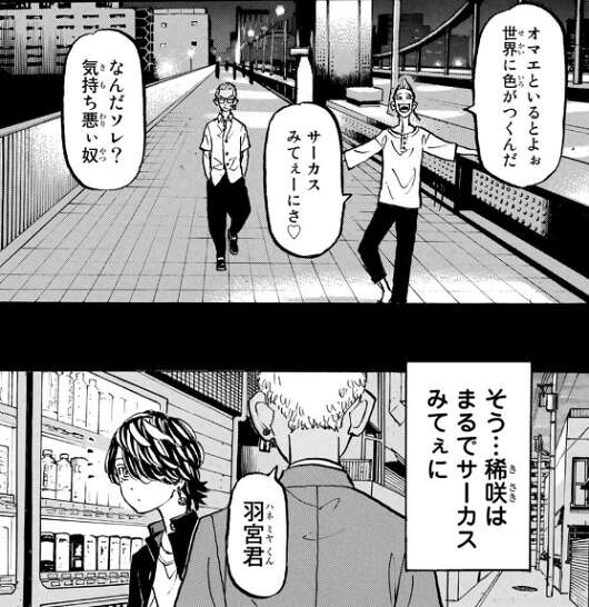 稀咲は人の心を掴むのが得意で、キヨマサ、パーちん、ぺーやんを陰で煽って人の心を操り、自分の思うように人を動かしていました。さらに稀咲は一虎や柚葉にも裏で接触していて、半間は新しい舞台を創りつづける稀咲を見て楽しんでいました。
