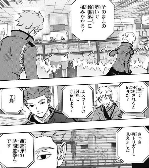 ヒュースと空閑はそのままの勢いで鈴鳴第一に挑みかかります。鈴鳴第一はエスクードによる壁の分断を注意しつつ、新人系で玉狛第2を追い込もうとします。そこで三雲が気付いたのは、ヒュースがさっきバイパーをまっすぐ撃ったのは鈴鳴第一にアステロイドだと思わせるためだと気付きます。