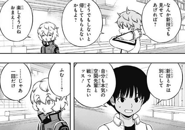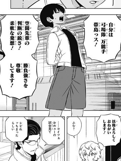 結局空閑は帯島にやらかした分を払わされることになり、帯島に影浦の「マンティス」の変化版の新技を披露します。お返しに弓場も自分の銃型トリガーによる早撃ちを見せる生真面目ぶりを見せ、最終戦に向けてお互い気合が入ります。