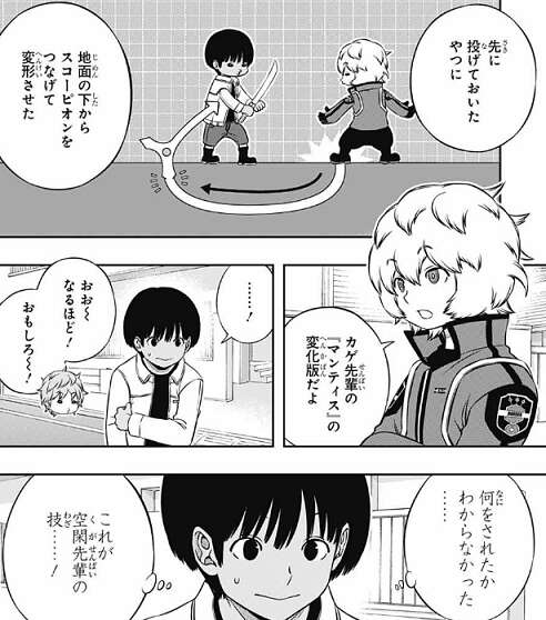 弓場は最初、「もぐら爪(モールクロー)」かと思いますが、先に投げておいたスコーピオンの刃に地面の下からスコーピオンをつなげて変形させた技でした。影浦のスコーピオンを2本つなげて使う技「マンティス」をヒントに、変化させた空閑の新技です。帯島に新技を披露し今日はこれでと立ち去ろうとする空閑ですが、弓場は払い過ぎだと空閑を引き止め空閑希望の勝負を一本だけしてやると言います。