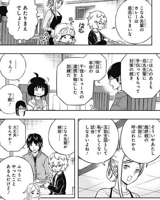 晩メシ中も、今日の訓練の続きの話をしつつ、明日以降の雨取とヒュースの連携の訓練の確認もして余念がありません。その時、小南が最終戦の解説に呼ばれている事を知り、空閑と烏丸が不安な気持ちを口にします。しかし小南は解説の経験はちゃんとあるそうで、後輩たちの失礼な態度に怒ります。