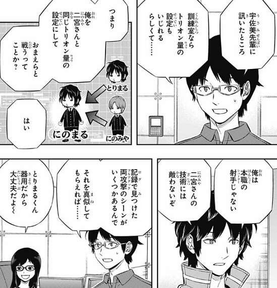 訓練室でトリオン量の設定を変更し、烏丸のトリオン量を二宮と同じ設定にして、ログにあった二宮の変則フルアタックのシーンを真似してもらい、その仮想・二宮相手に訓練を行います。